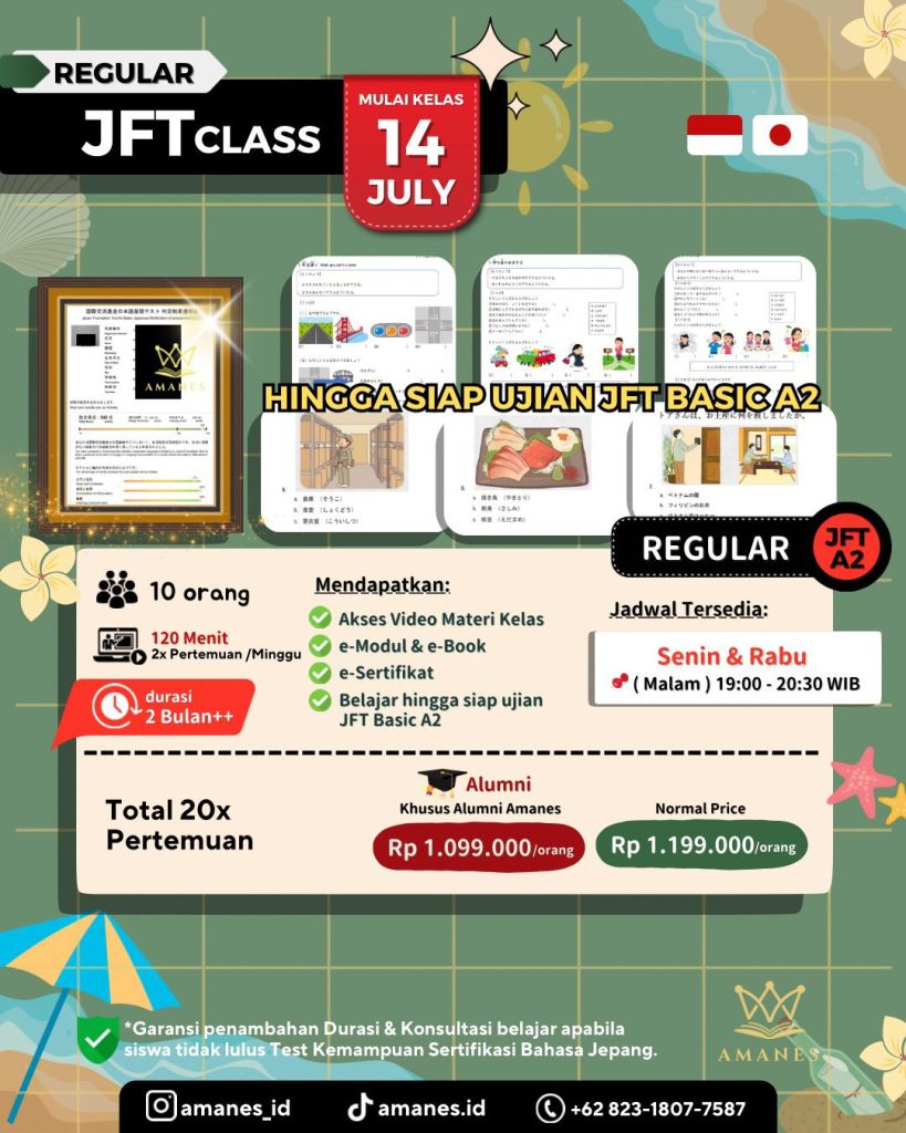 *Garansi Penambahan Durasi & Konsultasi belajar apabila siswa tidak lulus Test Kemampuan Sertifikasi Bahasa Jepang.